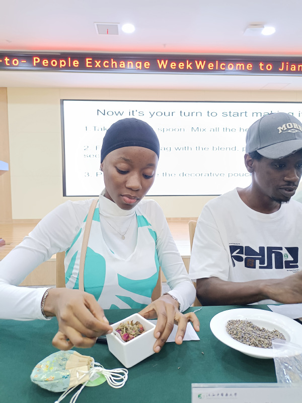 参观环节结束后,活动进入了趣味盎然的动手实践阶段——中药香囊制作体验。在专业老师的指导下,留学生们认识了艾绒、陈皮、芸香、薰衣草、玫瑰花、肉桂等具有芳香辟秽功效的中药材,并亲手称量、配伍、装袋,制作出一个个独具个性、药香馥郁的精致香囊。大家兴致勃勃,互相交流心得,现场气氛热烈而温馨。